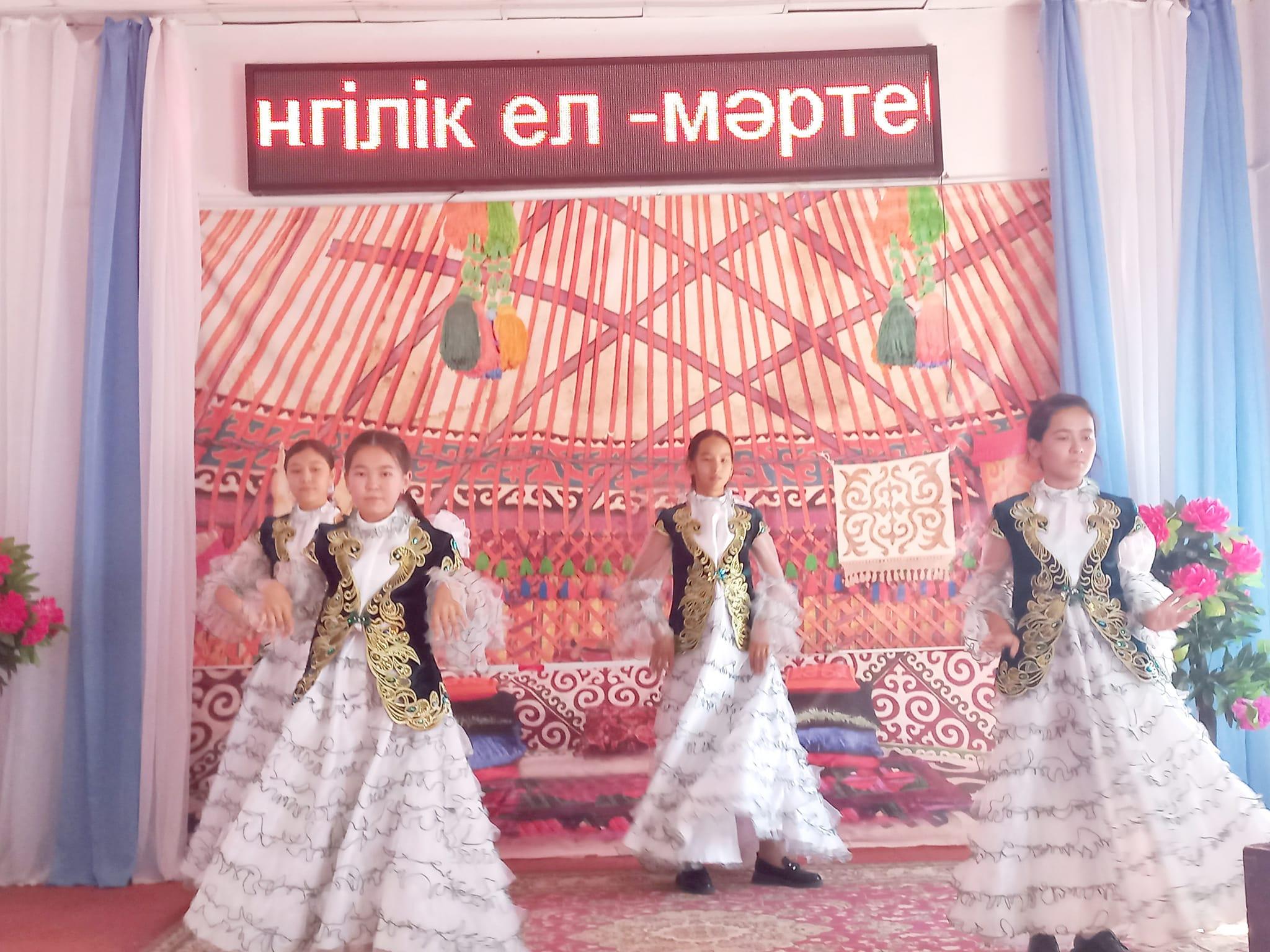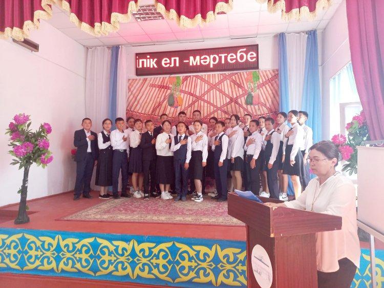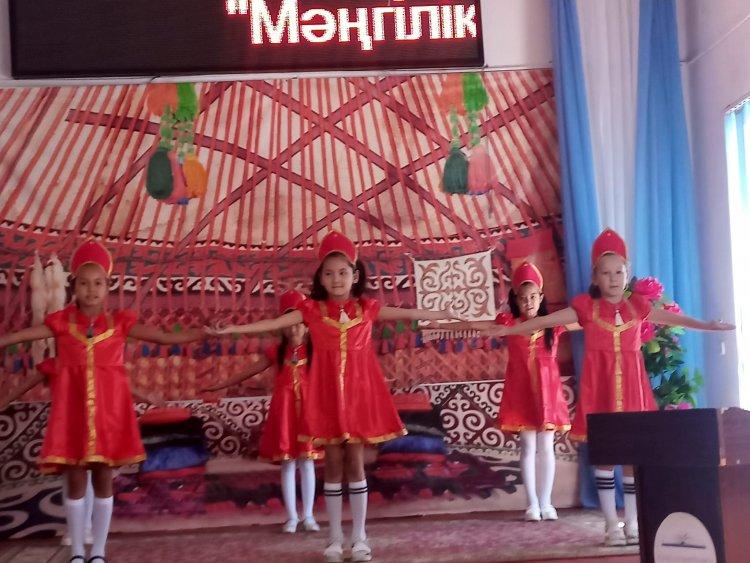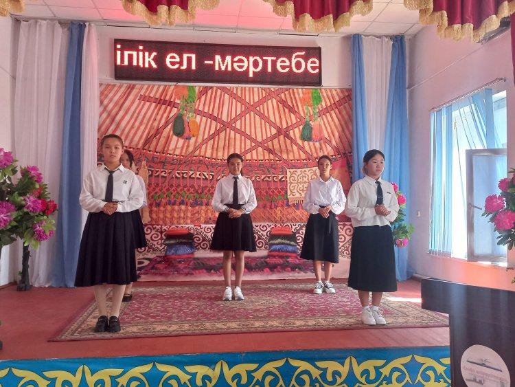 "МӘҢГІЛІК ЕЛ - МӘРТЕБЕЛІ ТІЛ" 01.09.2023 жылғы №23 хатының негізінде және «5 қыркүйек – Қазақстан халқы тілдері күні» мерекесіне орай қазақ, орыс, ағылшын тілі пәндері бойынша «Мәңгілік ел-мәртебелі тіл» тақырыбында онкүндік іс- шараның ашылу салтанаты. Қазақ тілі пән мұғалімі Г.Мамахова онкүндік іс-шарамен таныстырды. Оқушылар өз өнерлерін ортаға салды.