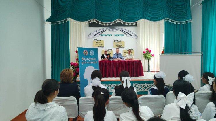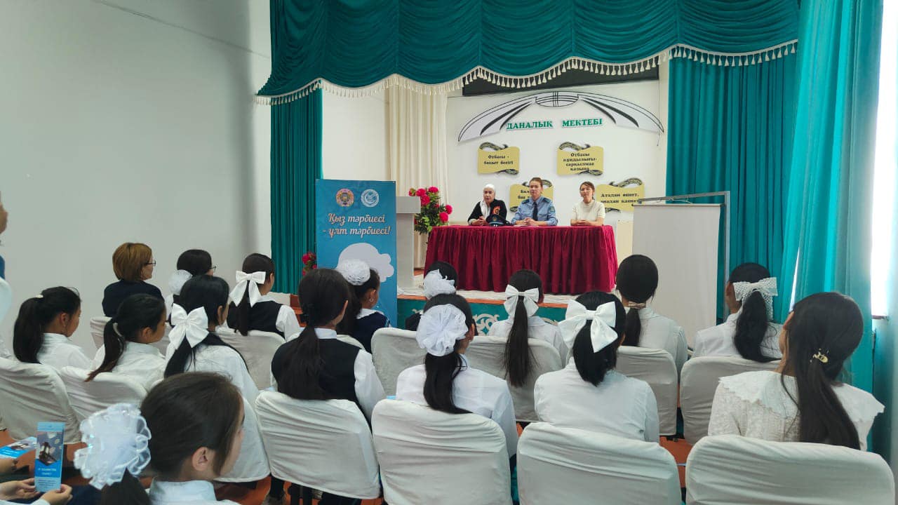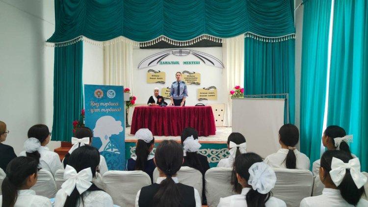 а көмектесу, жастарда патриотизм сезімін арттыру кажет. Өскелең жас ұрпақтың рухани адамгершілік білімін дурыс қалыптастыру, оны түрлі қауіп-қатерлерден қорғау, сананы көтеру - рухани-ағарту саласындагы басты мақсаттардың бірі екендігін айтып өтті. Зорлық – зомбылықтың алдын алуы, оқушылар арасында көңіл - күй күйзелісінің алдын алуы, қыздар арасында зорлық –зомбылыққа қарсы іс-қимыл, диструктивті және аутодиструктивті мінез , буллинг және кибербуллингтің алдын алуы жұмыстары барысында түсіндірілді.