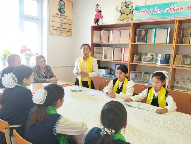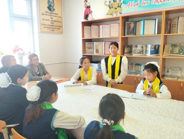 Мақсаты: Оқушыларды еркін сөйлеуге, өз көзқарасын ашық та жүйелі етіп дәлелдеуге, өз бағытын дұрыс ұсынуға жетелеу. Қарсы пікірдегі оқушылардың қойылған мәселелерді жан-жақты қарап, шешендік сөйлеу өнері дағдыларын және сендіру әдістерін қалыптастыру. Іс -шара соңында белсенділік танытқан оқушылар алғыс хаттармен марапатталды.