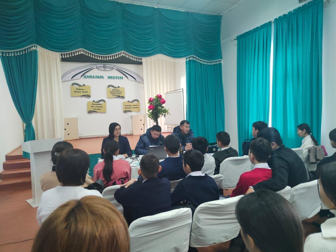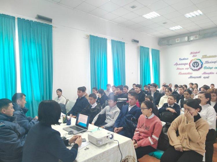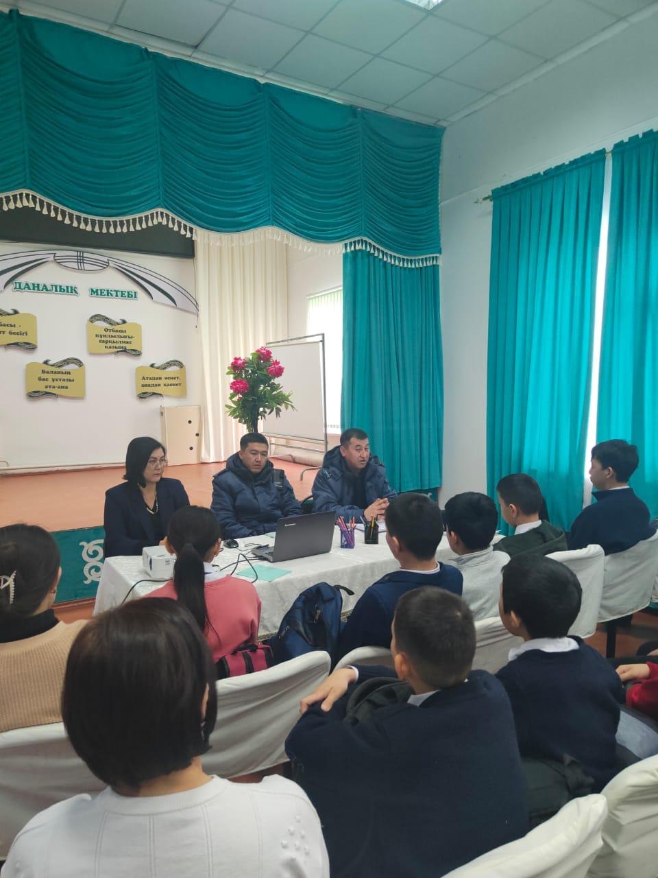 ында Кәмелетке толмағандар арасындағы құқық бұзушылықтың, зорлық-зомбылықтың алдын алу мақсатында Отырар АПБ-нің ЮПТ полиция капитаны Орынбай Арман мен Отырар АПБ-нің ЮПТ полиция аға лейтенатны Қалмахамбетұлы Асқар келіп, 7-9 сынып оқушыларына құқықбұзушылық пен зорлық -зомбылық барысында атқарарылып жатқан жұмыстармен, Заң баптармен таныстырып өтті. Солардың алдын алу барысында оқушыларды тәртіпке шақырды. Кәмелетке толмаған жасөспірімдердің кешкі мезгілде көшеге үлкендерсіз шықпауын, ойын сауық орталықтарына бармауын, автокөлік рөліне отырмауын баса айтып өтті.
