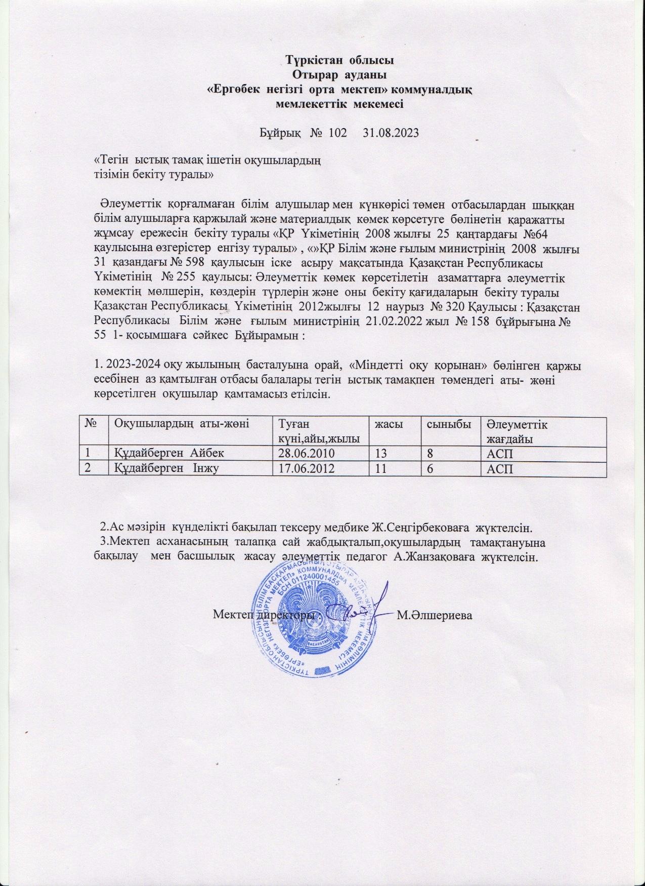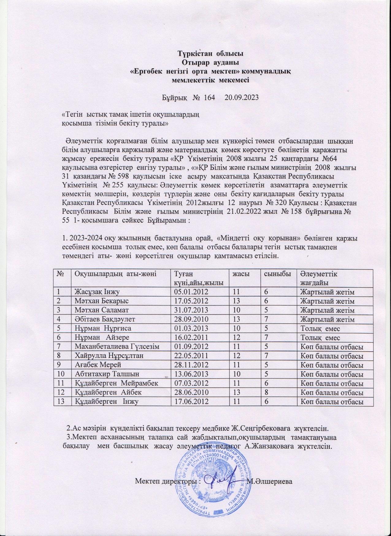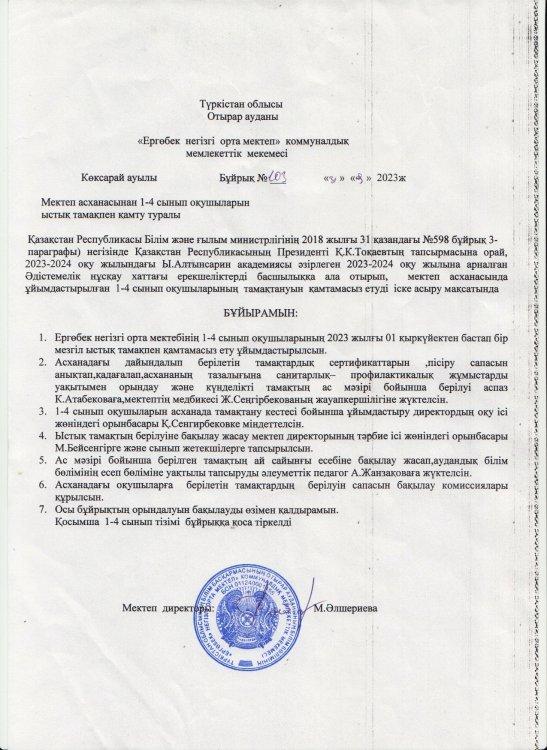 Ыстық тамақ ішетін оқушылардың бұйрықтары » "Ергөбек" негізгі орта мектебі